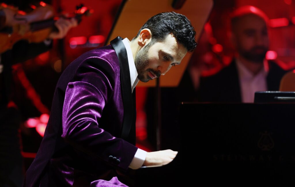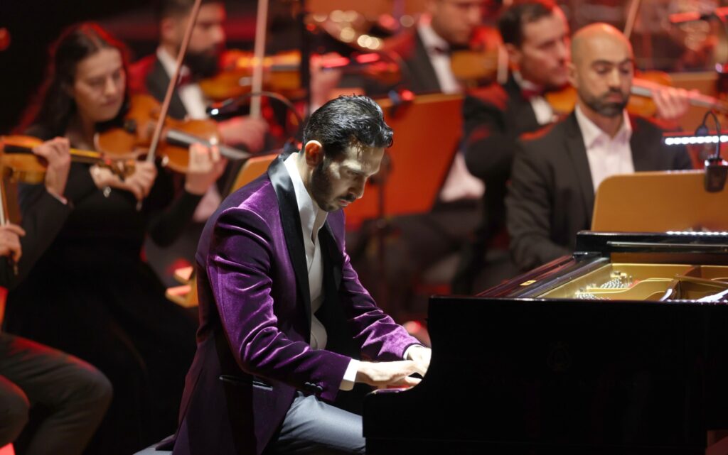 وافتتحت الأمسية بالعرض العالمي الأول لعمل *عمر الرحباني* الجديد: *كونشيرتو رقم ٢* للبيانو والأوركسترا ، الذي أسر الجمهور بحيويته وتنوّع ألوانه الأوركسترالية، مع دمج متقن لفرقة *التخت الشرقي* ضمن البناء الموسيقي، بما في ذلك حضور آلة الطبل بنبرتها العميقة والرنانة، ليقدّم العمل توليفة متوازنة بين الحسّ العربي واللغة السيمفونية الحديثة.