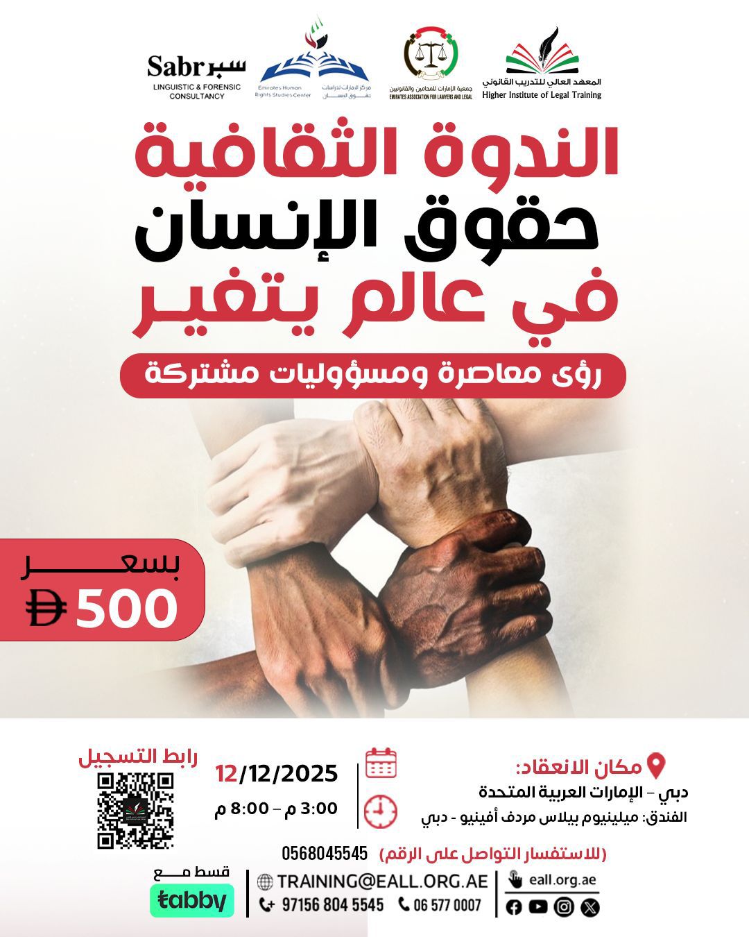 في أجواء فكرية وحقوقية مميزة، احتضنت دبي فعاليات ندوة “حقوق الإنسان في عالم يتغير – رؤى معاصرة ومسؤوليات مشتركة”، بتنظيم مركز الإمارات لدراسات حقوق الإنسان، بالشراكة مع المعهد العالي للتدريب القانوني، وجمعية الإمارات للمحامين والقانونيين، وبمشاركة شخصيات علمية وقانونية من دولة الإمارات والخليج.